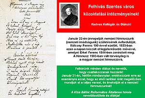 Kedves Kollégák és Diákok! Január 22-én ünnepeljük nemzeti himnuszunk (nemzeti imádságunk) születésének évfordulóját. Kölcsey Ferenc 190 évvel ezelőtt, 1823-ban ezen a napon készült el legjelentősebb művével, amelyet Erkel Ferenc 1844-ben zenésített meg. A Himnusz 1903-ban vált törvényileg is a magyar nemzet himnuszává. Felkérünk minden diákot és nevelőt, hogy csatlakozzanak hozzánk! Január 21-én, hétfőn mindannyian emlékezzünk erre az eseményre azzal, hogy az első tanítási órát megelőzően mondjuk el a teljes verset, és énekeljük el a nemzeti himnuszunkat!