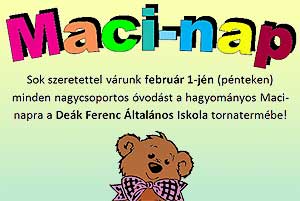 2013. február 1-jén (pénteken) sok szeretettel várnak minden nagycsoportos óvodást a hagyományos Maci-napra a Deák Ferenc Általános Iskola tornatermébe! A következő programok várják a gyerekeket 9 órai kezdéssel: - kézműveskedés - táncház - sorversenyek. A nap várva-várt programja a Tücsök zenekar műsora, ½ 11-es kezdéssel lesz!