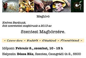 2013. február 2., szombat, 10.00-13.00 óráig sok szeretettel várnak minden érdeklődőt a 2013-as Szentesi Magbörzére a Dózsa-házba. Vetőmagok csere-beréje biogazdálkodók, hobbikertészek és érdeklődők számára...