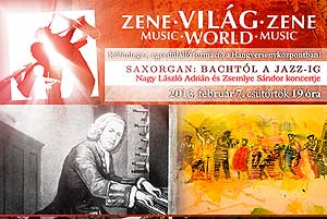 2013. február 7-én (csütörtökön) 19.00 órai kezdettel különleges, egyedülálló formáció lesz a Hangversenyközpontban! Saxorgan – „Bachtól a Jazz-ig” címmel Nagy László Adrián (orgona) és Zsemlye Sándor (fúvós hangszerek) ad koncertet.