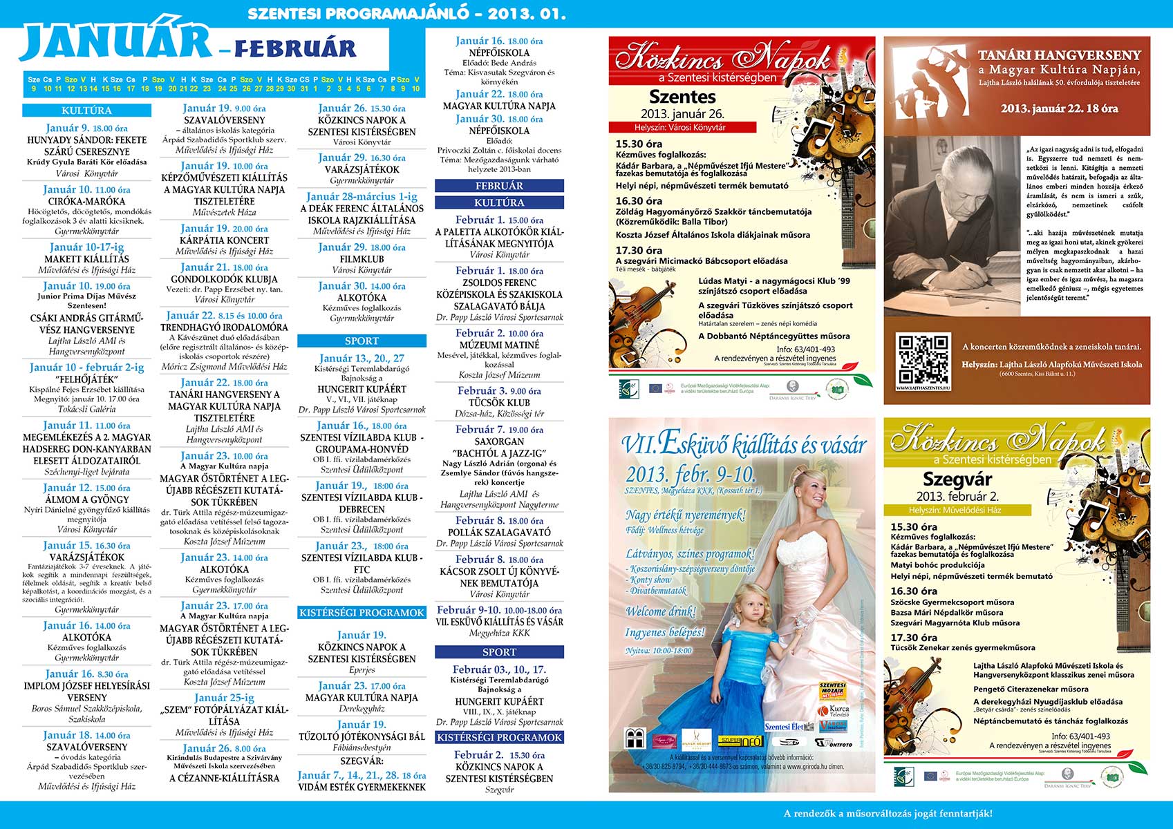 A hétvégén jelenik meg a Szentesi Programajánló 2013. januári száma, mely a következő egy hónap időtartam programjait, rendezvényeit hivatott népszerűsíteni. Az összeállításban részletesen megtalálhatjuk a helyi zenei, színházi, sport és egyéb szórakoztató rendezvényeit és azok helyszínét és időpontját. A Programajánlót keresse a FÓR magazinban!