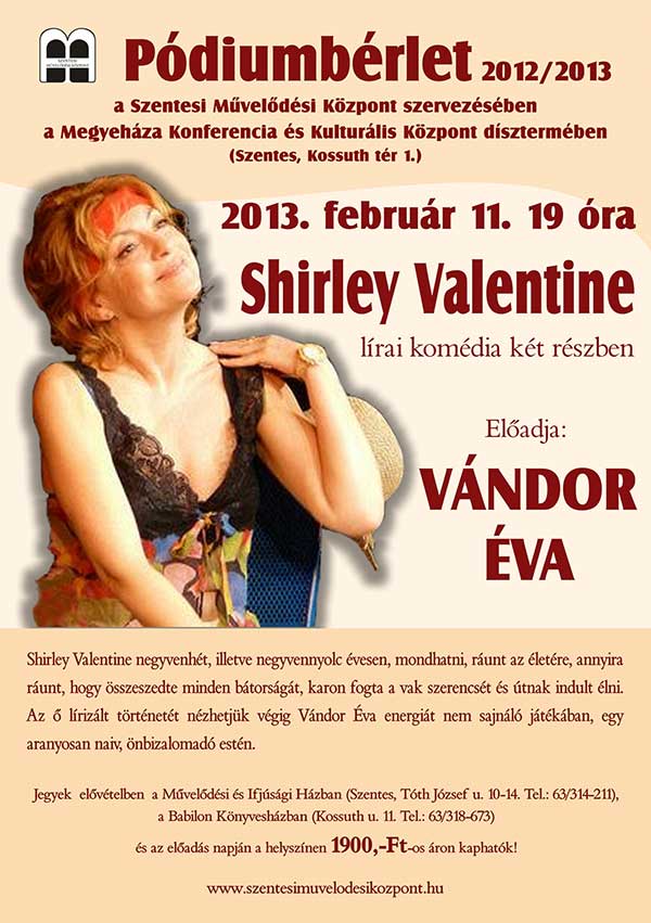 A Szentesi Művelődési Központ szervezésében a Megyeháza Konferencia és Kulturális Központ dísztermében 2013. február 11. 19.00 órai kezdéssel tekinthetjük meg a Pódiumbérlet következő előadását, mely Shirley Valentine - lírai komédia lesz. Előadja: VÁNDOR ÉVA