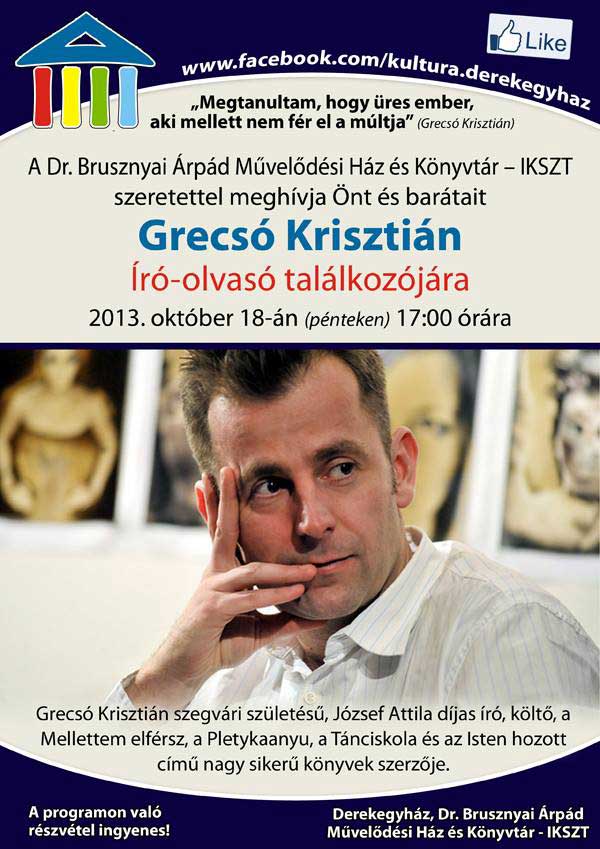 2013. október 18-án (pénteken) 17:00 órától Grecsó Krisztián, a Mellettem elférsz, a Pletykaanyu, a Tánciskola és az Isten hozott című nagy sikerű könyvek szerzője lesz vendégünk. A rendezvényre a belépés ingyenes! Helyszín: Derekegyház, Dr. Brusznyai Árpád Művelődési Ház és Könyvtár – IKSZT