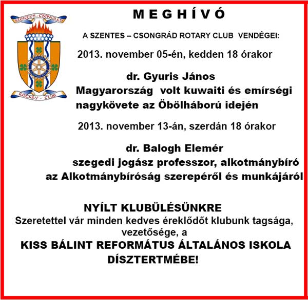 2013. november 13-án, szerdán 18 órakor dr. Balogh Elemér szegedi jogász professzor, alkotmánybíró az Alkotmánybíróság szerepéről és munkájáról számol be. A NYÍLT KLUBÜLÉSRE szeretettel vár minden kedves érdeklődőt A SZENTES – CSONGRÁD ROTARY CLUB tagsága, vezetősége