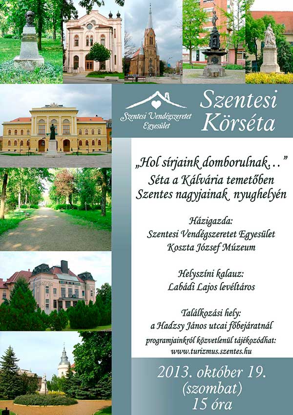 A Szentesi Körséta programsorozat következő állomása halottak napjához közeledve éppen a Kálvária temető lesz. Itt Labádi Lajos levéltáros kalauzolja végig az érdeklődőket Szentes nagyjainak nyughelyein. További részletek a plakáton!