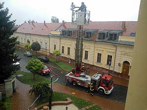 Szentes város központjában álló templomban tartottak gyakorlatot a szentesi tűzoltók. 2013. október 16-án szerdán a második emeleti karzaton csaptak fel a virtuális lángok, amelyekkel szemben a négy gépjárművel és összesen tíz fővel kiérkezett szentesi tűzoltók vették fel a harcot. A létrás szert a templom előtt állították fel, amelynek a feladata a lángok terjedésének megakadályozása volt a tetőszerkezet irányába. Katt a képre! Szentes, 2013. 10. 17.