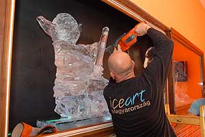 Már megszokhattuk, hogy minden évben jégszobrok várják a nem oly fagyos hangulatú vendégeket. Az idén M. Tóth Zsolt jégszobrász a Star Wars főszereplőit faragta ki jégből, melyek a szezon alatt az előtérben hűtött kirakatban várják a vendégeket. Katt a képre! Szentes, 2013. 10. 31.