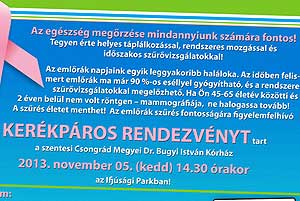 A jelentős mértékben megújul a Klinikai és Szűrő Mammográfiás Központ a szentesi Csongrád Megyei Dr. Bugyi István Kórházban. A lakosság körében történő figyelemfelhívás, a szűrővizsgálatok népszerűsítése, az emlőrák elleni küzdelem rendkívül fontos, ezért figyelemfelhívó közös kerékpáros rendezvényt szervez a Dr. Bugyi István Kórház, melyre ÖNT is várják! 2013. november 5. (kedd) 14.30, Ifjúsági Park.