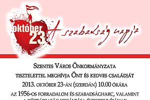 Szentes Város Önkormányzata tisztelettel meghívja Önt és kedves családját 2013. október 23-án (szerdán) 10.00 órára az 1956-os forradalom és szabadságharc, valamint a köztársaság kikiáltása évfordulójának VÁROSI ÜNNEPSÉGÉRE.