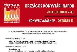 A Szentes Városi Könyvtár szeretettel meghív minden érdeklődőt a "Könyvtárak összefogása az emberi kapcsolatokért" című rendezvénysorozatára. A programok 2013. október 7-13 között lesznek a Városi Könyvtárban.