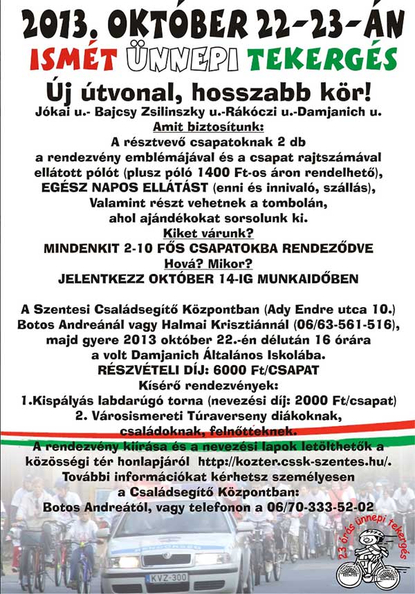 Szentes Város, valamit a Szentesi Családsegítő Központ a hagyományokhoz hűen idén is megrendezi a 23 órás tekerést. Október 14-ig várják a jelentkezéseket (munkaidőben) a Szentesi Családsegítő Központban.