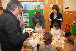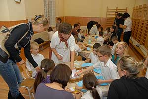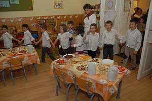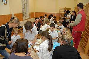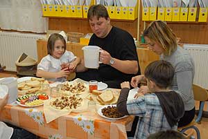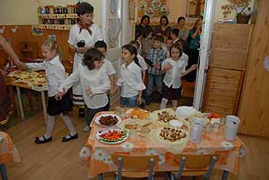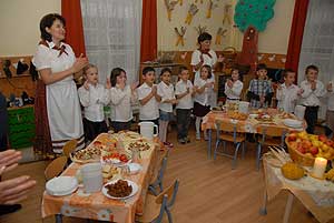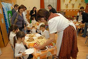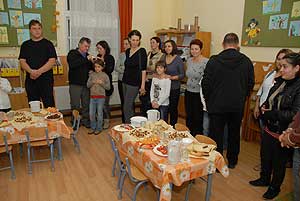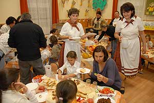 - Miután mindkét csapat részt vett a csutkadobáló versenyben, a libafarok lopó- és a fészeképítő játékban, és elkészültek a libákat ábrázoló alkotásokkal, kezdődhetett a szülők által felajánlott és előkészített Márton napi lakoma. (Köszönet érte a támogató családoknak!)