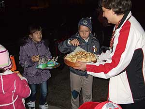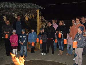 - A szülők és a gyermekek közösségének formálását nagyban elősegítő kötetlen beszélgetés közbeni falatozás után következett az est zárása, melynek fő eleme a tűz volt. Az óvoda udvarán meggyújtottuk a libákat ábrázoló lampionokat, majd egy rövid közös séta és éneklés után fellobbant a jó cselekedeteket jelképező Márton-napi tábortűz. Itt néhány gondolatot hallhattak még a szülők a tűzről, mint őselemről, miközben kínálásra kerültek a gyermekek által gyúrt, szaggatott és sütött „liba-linzerek”.