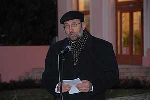 Beszédét Radnóti idézettel zárta, majd a szónokok megkoszorúzták az emléktáblát a Városi Könyvtár mellett.
