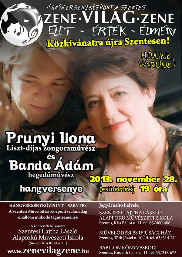 2013. november 28-án, csütörtökön 19.00 órai kezdettel hallhatjuk a Szentesi Hangversenyközpontban Prunyi Ilona Liszt-díjas zongoraművész és Banda Ádám hegedűművész hangversenyét a Zene-Világ-Zene programsorozat keretein belül. További részletek a plakáton!