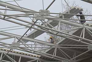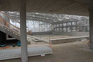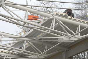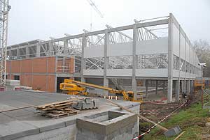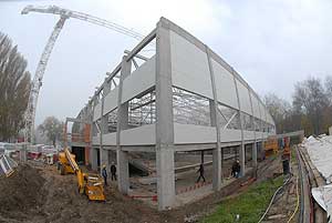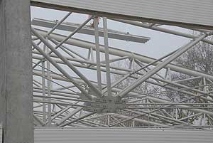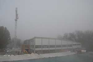 A napokban kezdték el és mára szinte kész is a csarnok teteje. A hőszigetelt lapokat vákumos technikával "szippantották fel", és a daru ennél fogva emelte a helyére a 200 kg-os egységeket.
