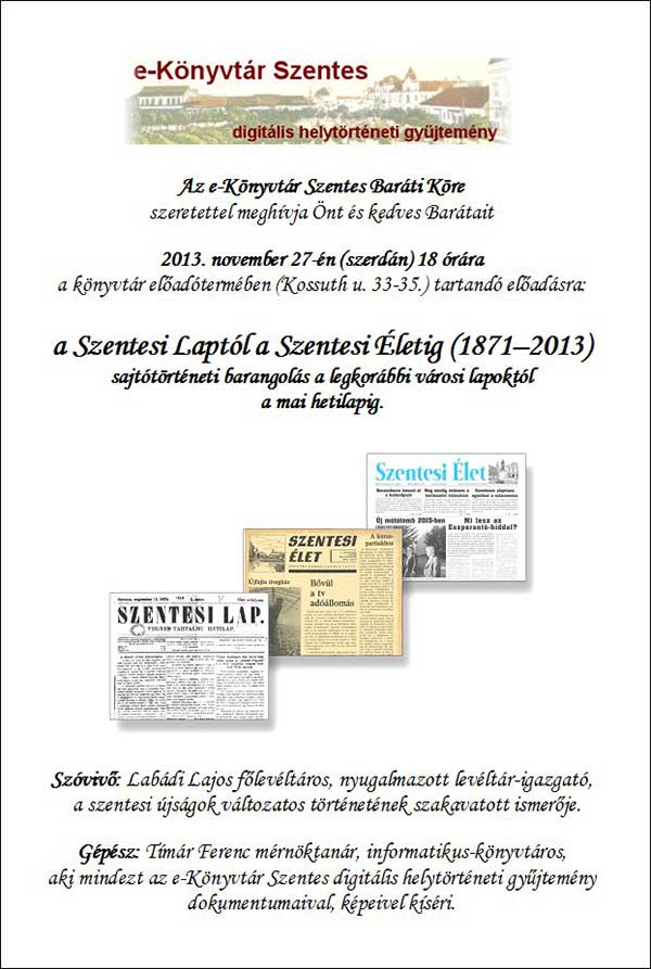 Az e-Könyvtár Szentes Baráti Köre szeretettel meghívja Önt és kedves Barátait 2013. november 27-én (szerdán) 18 órára a könyvtár előadótermében tartandó előadásra. a Szentesi Laptól a Szentesi Életig (1871-2013) sajtótörténeti barangolás a legkorábbi városi lapoktól a mai hetilapig.