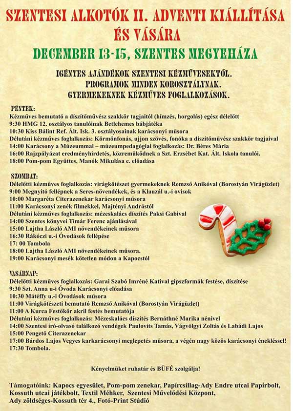 Második alkalommal rendezi meg a szentesi alkotók adventi kiállítással egybekötött vásárát a Kapocs Kistérségi Kulturális Közhasznú Egyesület. Hétvégén péntek reggeltől vasárnap estig a helyi alkotók munkái töltik meg a megyeháza konferencia központjának mindhárom emeleti termét. A helyszín tehát bővül a tavalyi rendezvényhez képest, de a kiállítók száma is jóval meghaladja az első adventi vásárét. Ezúttal 36-an – a hímzőktől a lekvárkészítőn át a keramikusig szinte teljes számban a városból – lesznek jelen és mutatják be portékáikat a látogatóknak, tudtuk meg a Kapocs egyesület elnökétől, Nyíri Dánielnétől.