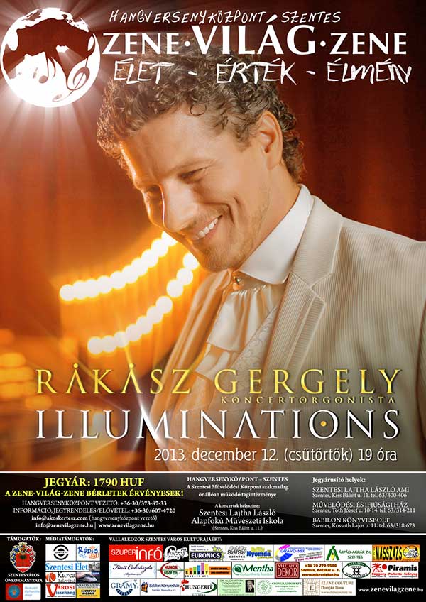 Fények, orgona, klasszikusok zenéje, Rákász Gergely - mindezek együtt lesznek jelen a szentesi Hangversenyközpont színpadán december 12-én csütörtökön este 7 órakor. Rákász Gergely koncertorgonista a nagy klasszikusok, J. S. Bach, Mozart, Verdi, Wagner műveinek megszólaltatását választotta, hogy adventi áhitatra hívja a szentesi koncertlátogató közönséget. A népszerű orgonista 15 éves korában adta első koncertjét. 2000-ben diplomázott az ELTE művész tanári szakán. Nem csak templomokban és katedrálisokban koncertezik Európa szerte, hanem országjáró „Iskola Program”-jával a fiatalok ezreihez juttatja el a klasszikus muzsikát. Vallja, hogy elsődleges célja az örömszerzés, amihez a zene és imádott hangszere az orgona kitűnő eszköz. Rákász Gergely megnyerő egyénisége, közvetlen műsorvezetése, a népszerű klasszikus dallamok, s a gyertyafényes környezet, valódi karácsonyváró hangulatot ígér, melyre remélhetőleg sokan vágyunk a decemberi zord napokban. Szeretettel várnak mindenkit a szentesi Zeneiskola hangversenytermébe 2013. utolsó Zene - Világ - Zene hangversenyére.