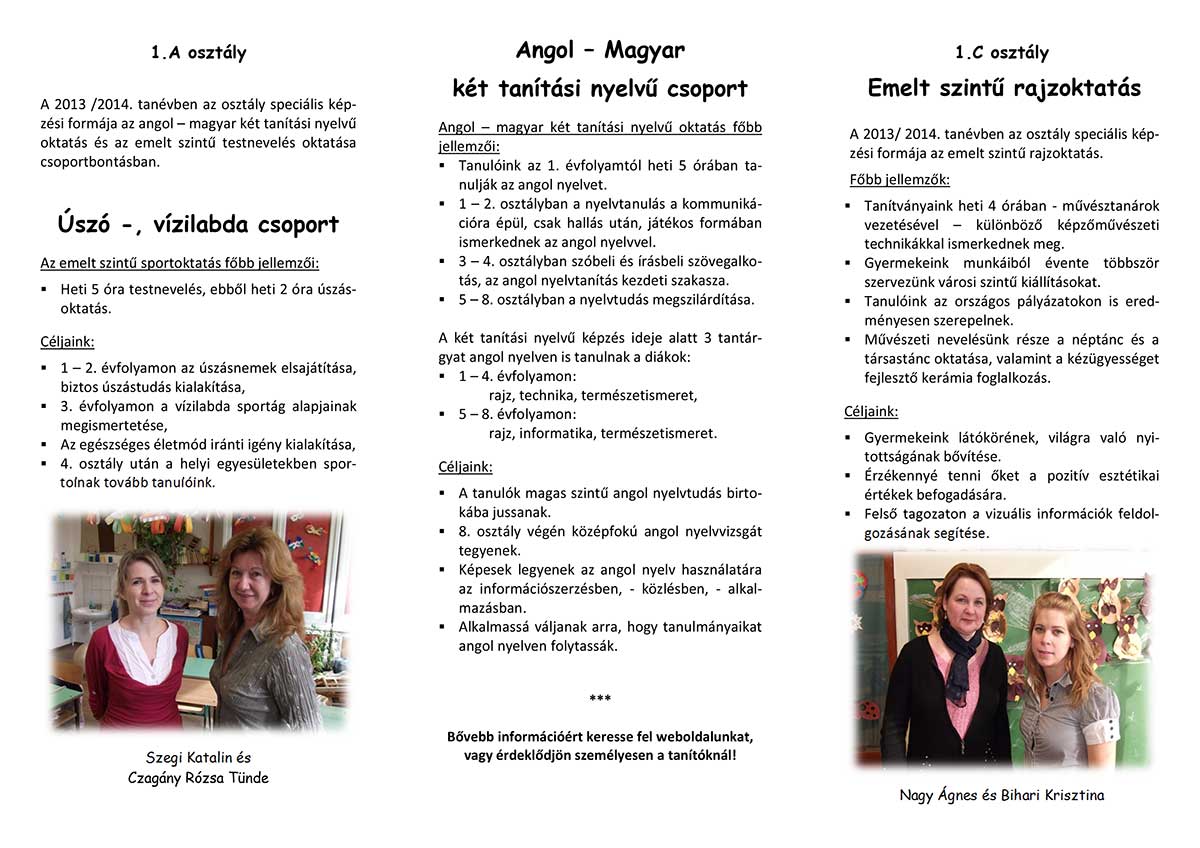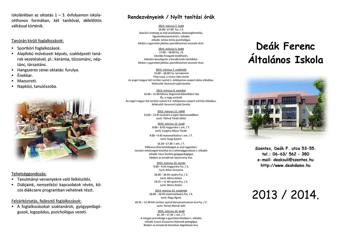 Hamarosan itt az általános iskolai beiratkozás. Azért, hogy segítsük az iskolaválasztást, az iskoláktól kapott szórólapot közreadjuk. Egyenlőre a Deák Ferenc általános iskola juttatta el hozzánk beiskolázási-, iskolaismertető szórólapjukat, de amit kapunk más iskolától is, úgy azt is közreadjuk a jobb tájékozódás érdekében.