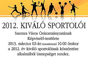 Szentes Város Önkormányzatának Képviselő-testülete 2013. március 02-án (szombaton) 10.00 órakor a 2012. év kiváló sportolóinak köszöntése alkalmából ünnepséget rendez. Élsportolók és edzőik elismerése, Az „ÉV SPORTOLÓJA”, AZ „ÉV EDZŐJE” címek és „ÉLETMŰDÍJ” átadása.