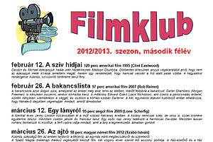 A filmrajongók figyelmébe ajánljuk az idén kilenc éves Városi Filmklub 2012/2013 szezonjának második félévének programját. Az ingyenes vetítések kéthetenként kedden a Szentesi Városi Könyvtárban (Kossuth utca 33-35.) 18.00 órai kezdettel kerülnek megrendezésre.