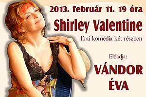 A Szentesi Művelődési Központ szervezésében a Megyeháza Konferencia és Kulturális Központ dísztermében 2013. február 11. 19.00 órai kezdéssel tekinthetjük meg a Pódiumbérlet következő előadását, mely Shirley Valentine - lírai komédia lesz. Előadja: VÁNDOR ÉVA Shirley Valentine negyvenhét, illetve negyvennyolc évesen, mondhatni, ráunt az életére, annyira ráunt, hogy összeszedte minden bátorságát, karon fogta a vak szerencsét és útnak indult élni. Az ő urizált történetét nézhetjük végig Vándor Éva energiát nem sajnáló játékában, egy aranyosan naiv, önbizalomadó estén.