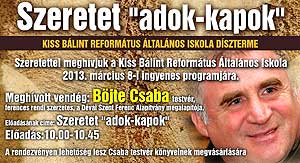 Szeretet "adok-kapok" címmel tart előadást 2013. március 8-án Böjte Csaba ferences rendi szervezet a Kiss Bálint Református Általános Iskola dísztermében. Minden érdeklődőt várnak szeretettel.