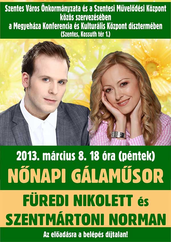 Szentes Város Önkormányzata és a Szentesi Művelődési Központ közös szervezésében a Megyeháza Konferencia és Kulturális Központ dísztermében tekinthetjük meg 2013. március 8-án 18.00 órai kezdettel Füredi Nikolett és Szentmártoni Norman előadásában a Nőnapi Gálaműsort. Az előadásra a belépés díjtalan!