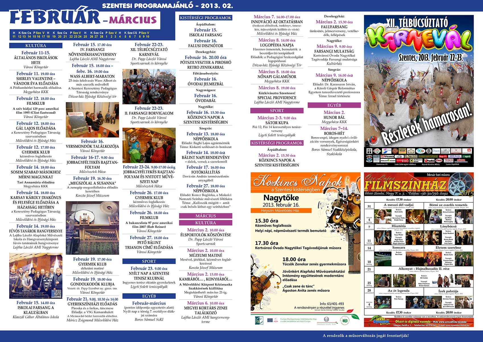 A hétvégén jelenik meg a Szentesi Programajánló 2013. februári száma, mely a következő egy hónap időtartam programjait, rendezvényeit hivatott népszerűsíteni. Az összeállításban részletesen megtalálhatjuk a helyi zenei, színházi, sport és egyéb szórakoztató rendezvényeit és azok helyszínét és időpontját. A Programajánlót keresse a FÓR magazinban!