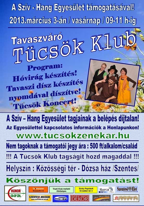 A Szív - Hang Egyesület támogatásával kerül megrendezésre 2013. március 3-án a Tavaszváró Tücsök Klub a Dózsa-házban. Mindenkit szeretettel vár a Tücsök Zenekar!