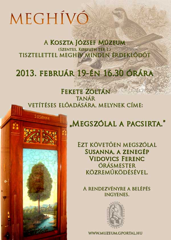 A Koszta József Múzeumba várják mindazokat, akik már nagyon várják a tavasz. 2013. február 19-én Zsuzsanna napon újra megszólal a Koszta József múzeumban található Susanna névre hallgató zenegép. Délután fél 5 órakor Fekete Zoltán tanár "Megszólal a pacsirta" címmel tart előadást, majd Vidovics Ferenc órásmester közreműködésével megdaloltatják a zenegépet. A hosszú tél végén ez az esemény már kedves hagyomány így sokan várják a pacsirta és a Zsuzsannák énekét!