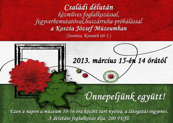 2013. március 15-én a nemzeti ünnepünkön ebéd után "Családi délutánra" várnak minden érdeklődőt a Koszta József Múzeumban. A programban lesz kézműves foglalkozás, fegyverbemutató és huszárruha-próbálás. Minden érdeklődőt várnak 14.00 órától 16.00 óráig.