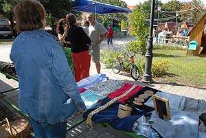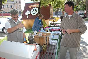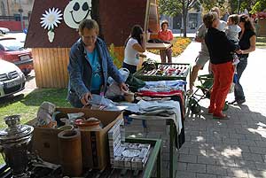 Felkértük kézműveseinket, a festőket, a foltvarrókat, a hímzőket is, hozzák ki alkotásaikat. Lehet hozni magokat, cserélhetünk hölgyestike magot padlizsánmagra, két szobapáfrány ér egy fikuszt; kérhetünk tanácsot, hogyan teleltessük a muskátlit a panelban.(Sajnos, szerintem sehogy!) Hozatunk ki székeket, hogy érettebb csereberélőink le tudjanak ülni.