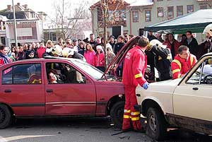 Két gépkocsi karambolozott Csongrád belvárosában szombaton. A kora délutáni balesetben részt vevő két gépjárműben fiatalok ültek, többen – szemmel láthatóan – megsérültek, és kiderült, hogy az egyik jármű vezetője ittas volt. Az ilyen esetek általában éjszaka történnek, a szombati karambol azonban nem véletlenül volt látható fényes nappal: a Magyar Vöröskereszt és a Bölcső Csongrádi Nagycsaládosok Egyesületének fiatal aktivistái a mentők, a rendőrség és a katasztrófavédelem munkatársaival közösen mutatták be: milyen tragédiát okozhat a felelőtlenség.