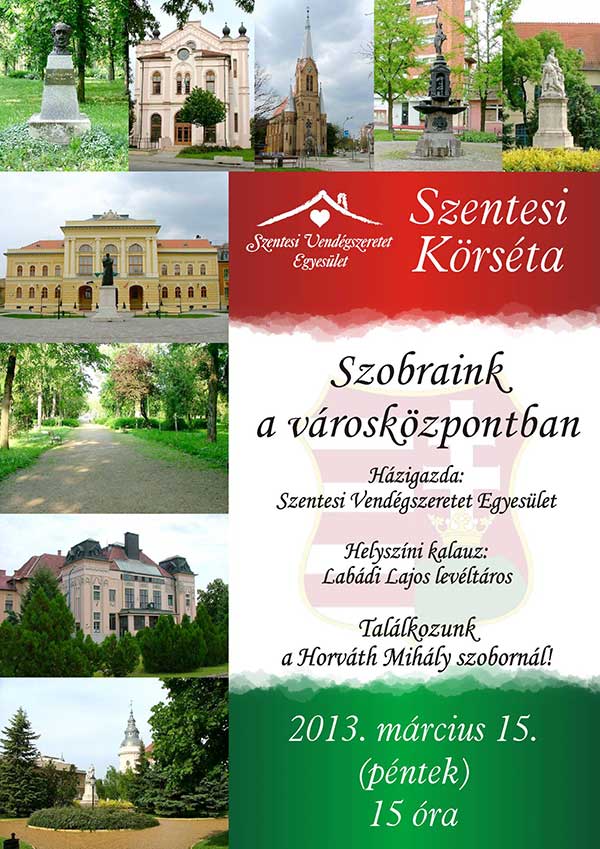A Szentesei Vendégszeretet Egyesület harmadik éve szervezi meg az egyre népszerűbb Városi Körsétáit. Tavasztól késő őszig havonta különböző színhelyekre invitálja az egyesület a város lakóit és a turistákat. A rendezvénysorozat nyitó eseménye mindig március 15-én van, nem lesz ez másképpen idén sem. A belváros szobraival ismerkedhetnek meg közelebbről az érdeklődők, melyhez Labádi Lajos levéltáros nyújt segítséget. Március 15-én 15 órától szeretettel várnak mindenkit. Találkozóhely: a Horváth Mihály szobornál.