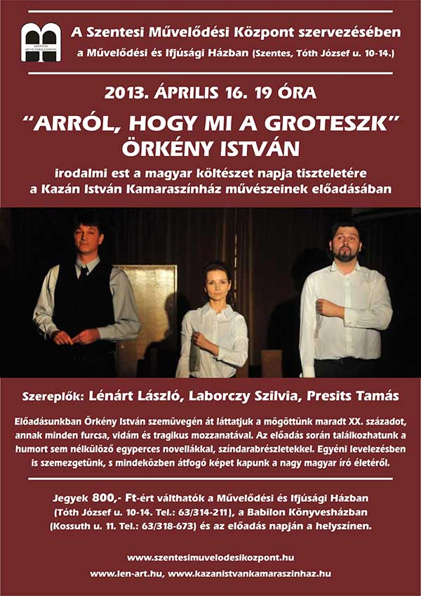 2013. április 16-án 19.00 órai kezdettel irodalmi estet szervez a magyar költészet napja tiszteletére a Szentesi Művelődési Központ. Előadásban Örkény István szemüvegén át láttatjuk a mögöttünk maradt XX. századot, annak minden furcsa, vidám és tragikus mozzanatával. A kamaraszínházi előadás során találkozhatunk a humort sem nélkülöző egyperces novellákkal, színdarabrészletekkel. Egyéni levelezésben is szemezgetünk, s mindeközben átfogó képet kapunk a nagy magyar író életéről. Szereplők: Lénárt László, Laborczy Szilvia, Presits Tamás, a Kazán István Kamaraszínház művészei