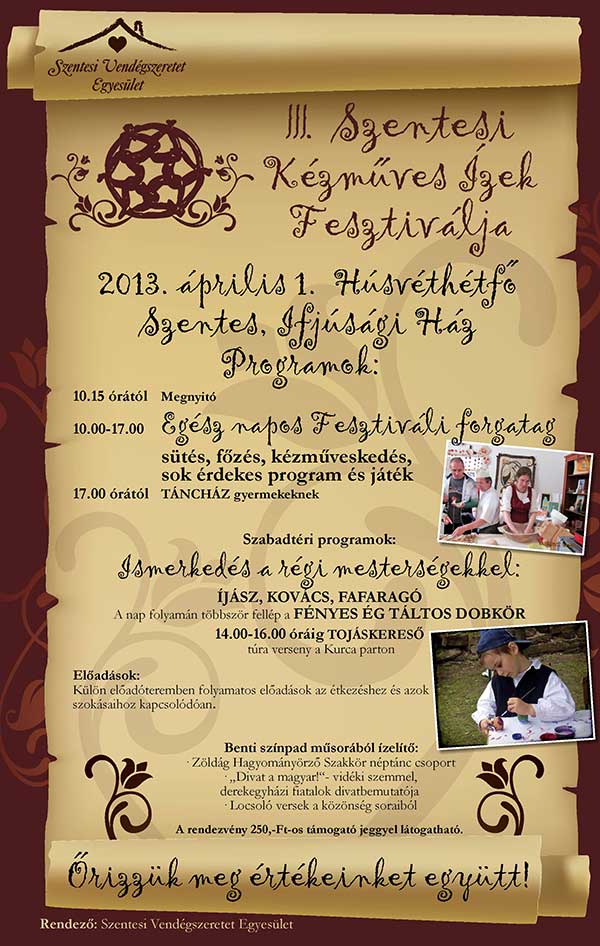 „Őrizzük meg értékeinket együtt” a jelmondata a Szentesi Vendégszeretet Egyesületnek, melynek tagjai immár harmadik alkalommal rendezik meg idén a Kézműves Ízek Fesztiválját Szentesen 2013. április 1-én, Húsvéthétfőn.