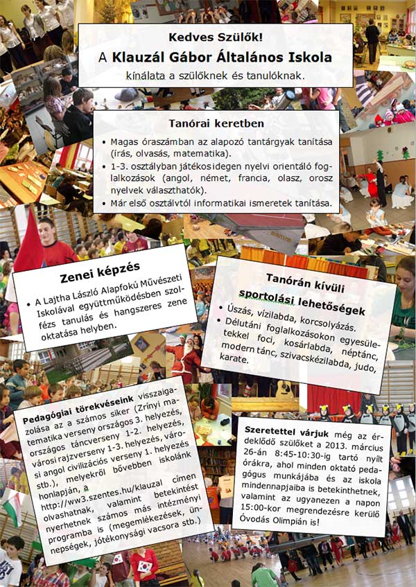 Pedagógiai törekvéseink visszaigazolása az a számos siker (Zrínyi ma-tematika verseny országos 3. helyezés, országos táncverseny 1-2. helyezés, városi rajzverseny 1-3. helyezés, városi angol civilizációs verseny 1. helyezés stb.), melyekről bővebben iskolánk honlapján, a http://ww3.szentes.hu/klauzal címen olvashatnak, valamint betekintést nyerhetnek számos más intézményi programba is (megemlékezések, ünnepségek, jótékonysági vacsora stb.)
