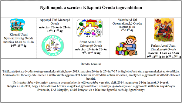 Klauzál Utcai Nyolcszínvirág Óvoda március 12-én és 13-án 1600-1800-ig Apponyi Téri Mocorgó Óvoda március 20-án 900-1100-ig és 21-én 1500-1700-ig Szent Anna Utcai Csicsergő Óvoda március 19-én és 20-án 900-1100 óráig Vásárhelyi Úti Gyermekkuckó Óvoda március 11-én 900-1100-ig Farkas Antal Utcai Kincskereső Óvoda március 11-én és 22-én 900-1100-ig és 1600-1730-ig