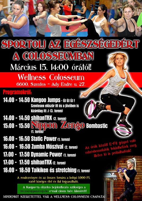 Aki nemzeti ünnepünket aktívan, sportosan és egészségesen kívánja eltölteni, annak íme egy lehetőség, melyet a délelőtti megemlékezés után vehet igénybe. A Wellness Colosseum, már hagyományosan sportnapot szervez ezen a napon. Az idén is sok-sok különlegességgel készülnek. A részletek a plakáton megtekinthetők!