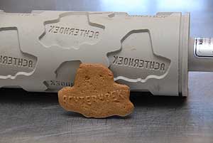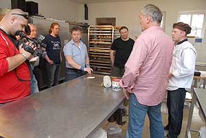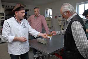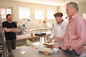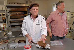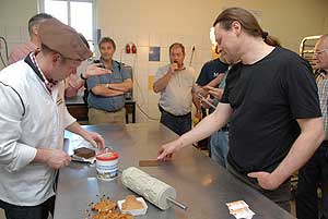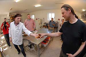 Érdekes volt hallani a humortól sem mentes előadást, mely akkor teljesedett ki, amikor előkerült a csempész kenyér! Régen ilyen kenyérbe sütöttek bele sok-sok dolgot, melyet csempészni akartak, de mára már csak a gasztronómiai értéke maradt meg. Kb. 2 mm-es szeletekre szelt kenyér egyetlen feladata, hogy megtartsa a rátett holland sajtot. Mindezek mellett azért finom is. :-) Elkészítése picit hosszadalmas, mert 12-14 óra hosszat kell a kemencében tartani, ahol nem sül, hanem inkább megfő! 250 C fokon indul a sütés, majd lekapcsolják a kemencét ami fél nap alatt hűl le és addig benne van a tészta is. A jobb eltarthatóság miatt vákumcsomagolásba teszik.