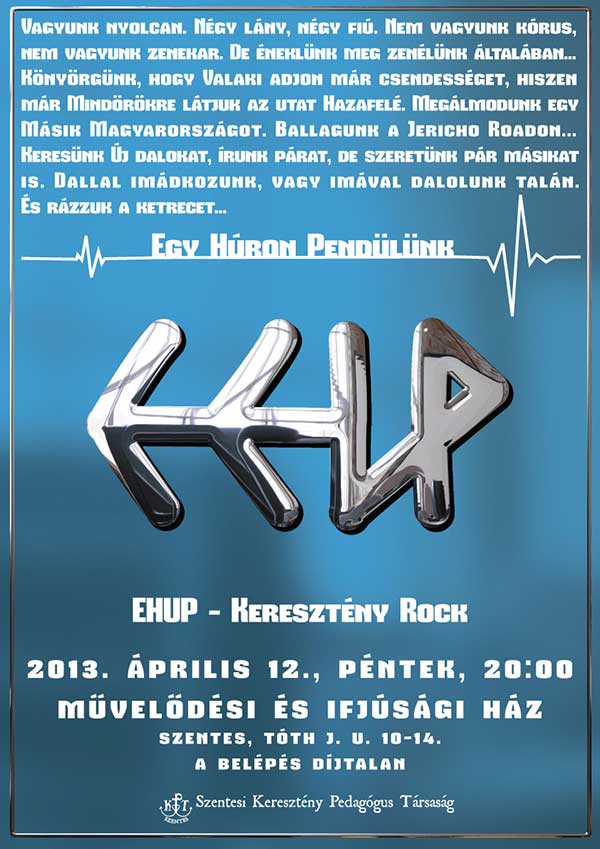 A Szentesi Keresztény Pedagógus Társaság 2013. április 12-én 20.00 órai kezdettel vár minden zeneileg "mindenevő" érdeklődőt egy érdekes keresztény rock koncertre a Művelődési és Ifjúsági Ház pódiumtermébe. A zenei csemegét az EHUP - Egy Húron Pendülünk együttes szolgáltatja. A belépés díjtalan!