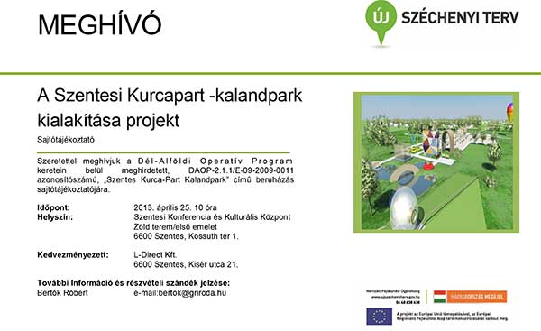 Mindez csak ízelítő, a Dél-Alföldi Operatív Program keretein belül meghirdetett, DAOP-2.1.1/E-09-2009-0011 azonosítószámú, „Szentes Kurca-Part Kalandpark” című beruházás sajtótájékoztatója előtt, mely 2013. április 25-én 10.00 órakor lesz megtartva a Megyeháza Konferencia és Kulturális Központ Zöld teremében /első emelet/.