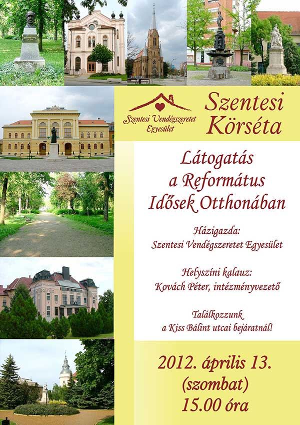 2013. április 13-án 15.00 órai kezdettel a Szentesi Vendégszeretet Egyesület következő körsétája során látogatást tehetünk a Református Idősek Otthonában. A látogatókat körbevezeti: Kovách Péter az intézmény vezetője.