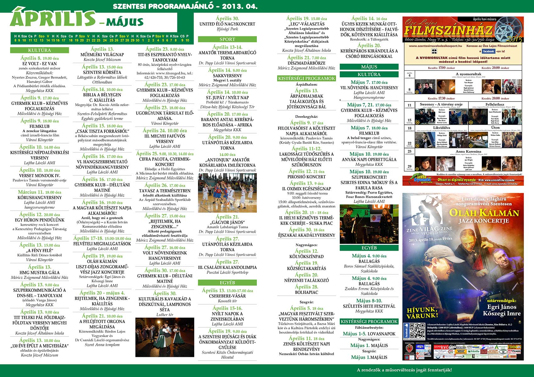 A hétvégén jelenik meg a Szentesi Programajánló 2013. áprilisi száma, mely a következő egy hónap időtartam programjait, rendezvényeit hivatott népszerűsíteni. Az összeállításban részletesen megtalálhatjuk a helyi zenei, színházi, sport és egyéb szórakoztató rendezvényeit és azok helyszínét és időpontját. A Programajánlót keresse a FÓR magazinban!