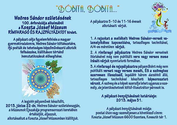 Weöres Sándor születésének 100. évfordulója alkalmából a Koszta József Múzeum RÍMFARAGÓ ÉS RAJZPÁLYÁZATOT hirdet. A pályázat célja figyelemfelhívás a magyar gyermekirodalomra, Weöres Sándor költészetére, ifjú poéták és tehetséges képzőművészeti alkotók felfedezése, kiállításon történő bemutatkozásuk elősegítése.