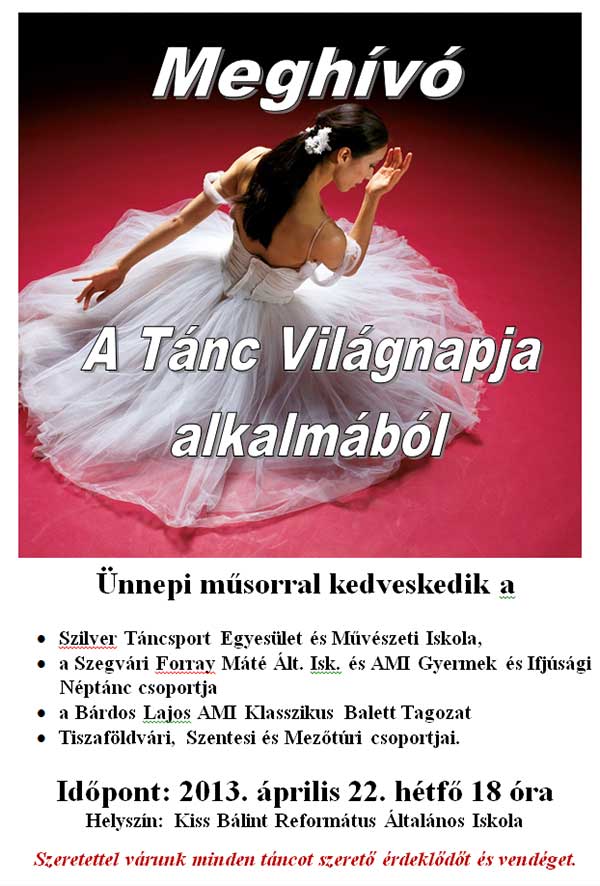 Ünnepi műsorral kedveskedik a Tánc Világnapja alkalmából a • Szilver Táncsport Egyesület és Művészeti Iskola, • a Szegvári Forray Máté Ált. Isk. és AMI Gyermek és Ifjúsági Néptánc csoportja • a Bárdos Lajos AMI Klasszikus Balett Tagozat • Tiszaföldvári, Szentesi és Mezőtúri csoportjai. Időpont: 2013. április 22. hétfő 18 óra Helyszín: Kiss Bálint Református Általános Iskola Szeretettel várnak minden táncot szerető érdeklődőt.