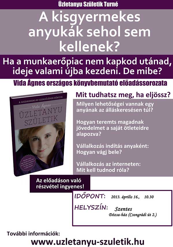 Vida Ági előadásából kiderül: - Milyen lehetőségei vannak egy anyukának az álláskeresésen túl? - Hogyan teremts magadnak jövedelmet a saját ötleteidre alapozva? - Vállalkozás az interneten: Hogyan vágj bele? - Hol rontja el a legtöbb kezdő vállalkozó és te hogyan kerüld el a buktatókat? - Vállalkozás indítás anyaként: hogyan jusson időd mindenre?