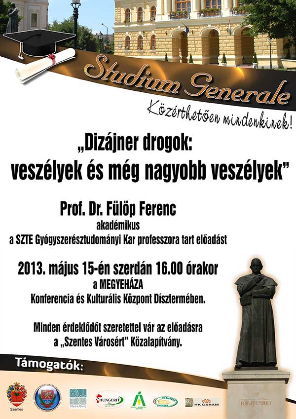 A Studium Generale programban "Közérthetően mindenkinek!" szól a „Dizájner drogok: veszélyek és még nagyobb veszélyek” című Prof. Dr. Fülöp Ferenc akadémikus a SZTE Gyógyszerésztudományi Kar professzorának előadása. 2013. május 15-én szerdán 16.00 órakor a MEGYEHÁZA Konferencia és Kulturális Központ Dísztermébe vár minden érdeklődőt a „Szentes Városért” Közalapítvány.